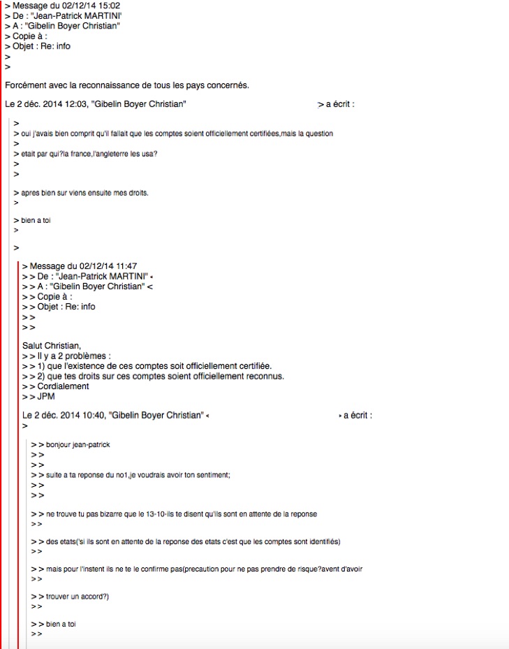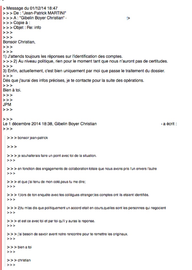 Christian Gibelin-Boyer got in contact with Jean Patrick Martini, leading inspector of DNEF, the National Directorate of Tax Investigations of France. Martini and Gibelin-Boyer met several times to change information of the said accounts. The DNEF started to investigate.
