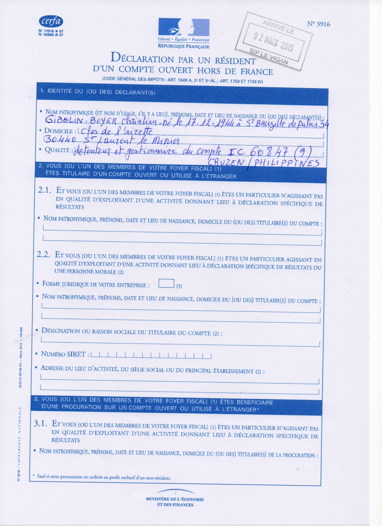 To give the National Directorate of Tax Investigations a possibility to start the official claim in the name of the French citizen Christian Gibelin-Boyer, Martini asked him to submit the form 3916 „Statement by a resident of an account outside France“, which he officially placed at the fiscal authority of the Gard Department on March 2, 2015