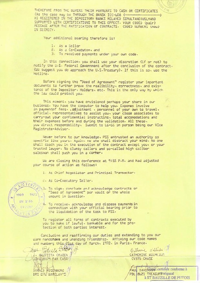 In May 1969, the so called "5th Conference" took place in Paris. This conference records a summary of the meetings and the whole development of this affair. In order to obfuscate the true owners of the assets and the liabilities with U.S. government and CIA, J. Bautista Cruz was on 21 March 1972 declared the owner of all rights. He was charged to sell money and gold lying on the banks, and to transfer the proceeds to the owners of the fictitious companies. The Paris protocol describes the incredible trust and faith of the owners in J. Cruz Bautista. But although the owner group did bolster J.B. Cruz up over years, the ambitious scheme was not successful.