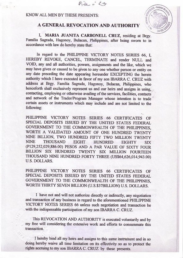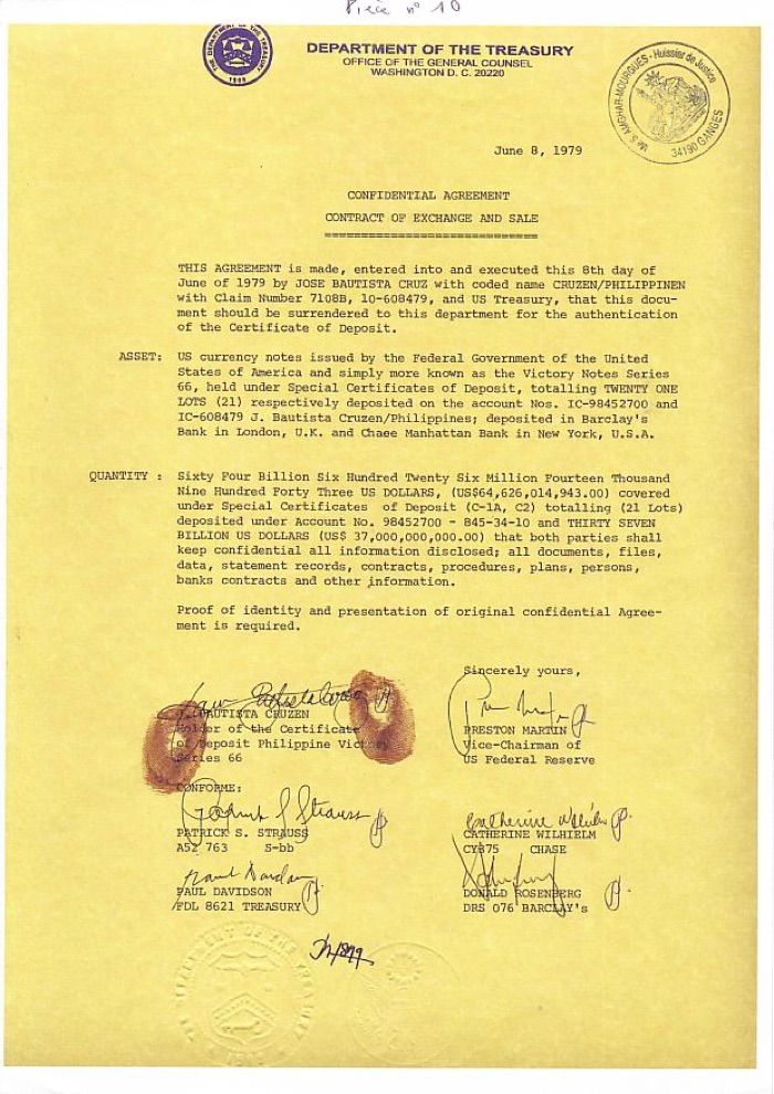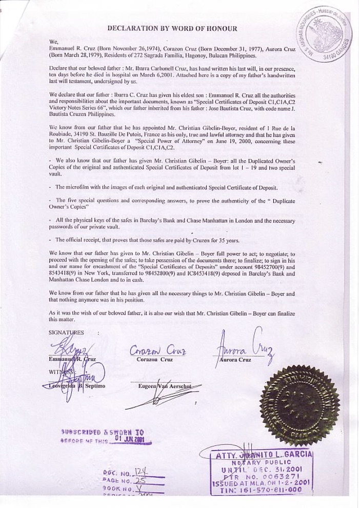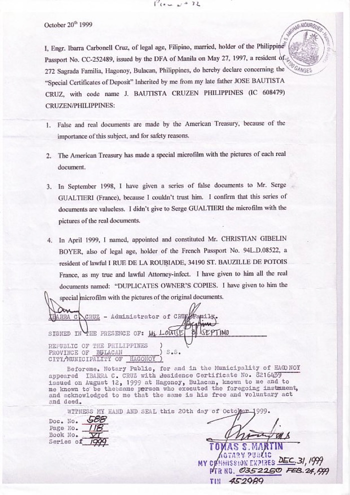 J. Bautista Cruz died suddenly and disconcertingly on October 7, 1990. But before his death in 1990, J. Bautista Cruz had brought to Manila the original documents, the microfilm, keys and access codes to the bank vaults. He transferred full ownership and all the powers to his wife and his youngest son as heirs. This relating document has been approved by the U.S. government.