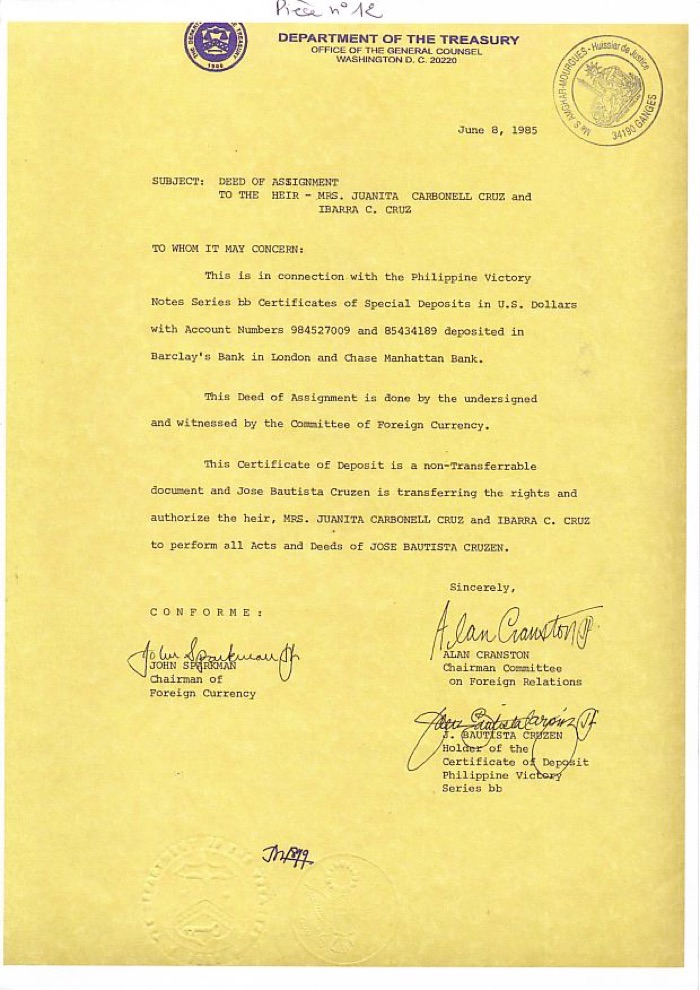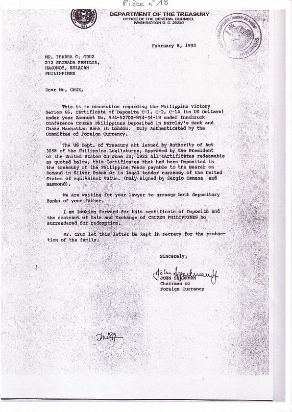 •concerning correspondence of the heirs Cruz with U.S. Department of Treasury, in which the inheritance is recognized;