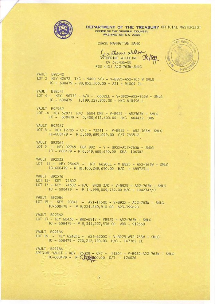 Until today, assets remain in the original boxes on special deposit accounts at the involved banks. The Philippine peso was exchanged for a value of 0.50 in U.S. dollars. The money as US emissions on metal base are taken out of circulation, they represent a fixed redemption value, which at the time (1969) has been fixed on gigantic 129,252,029,896.00 American Dollars. By the higher price of gold the accounts did immensely increase since then. Officially, worth assets in the banks are not available. And even though the assets were at this time only intended for deposit or storage, it happened and still happens again and again that the banks take capital from the monetary stock and use it as guarantee assets. This situation has prompted the banks to put a "concrete wall" against usual legal inquiries.