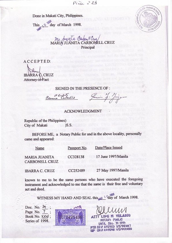After long discussions of J. Bautista Cruz's widow Maria Carbonell Juanita Cruz with the American authorities, Mrs. Cruz died a sudden death on March 21, 1998. She left her son Ibarra Carbonell Cruz as heir.