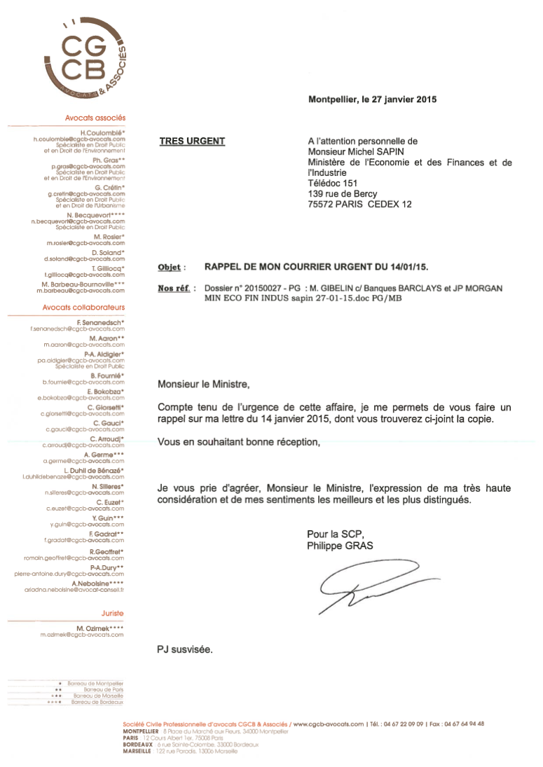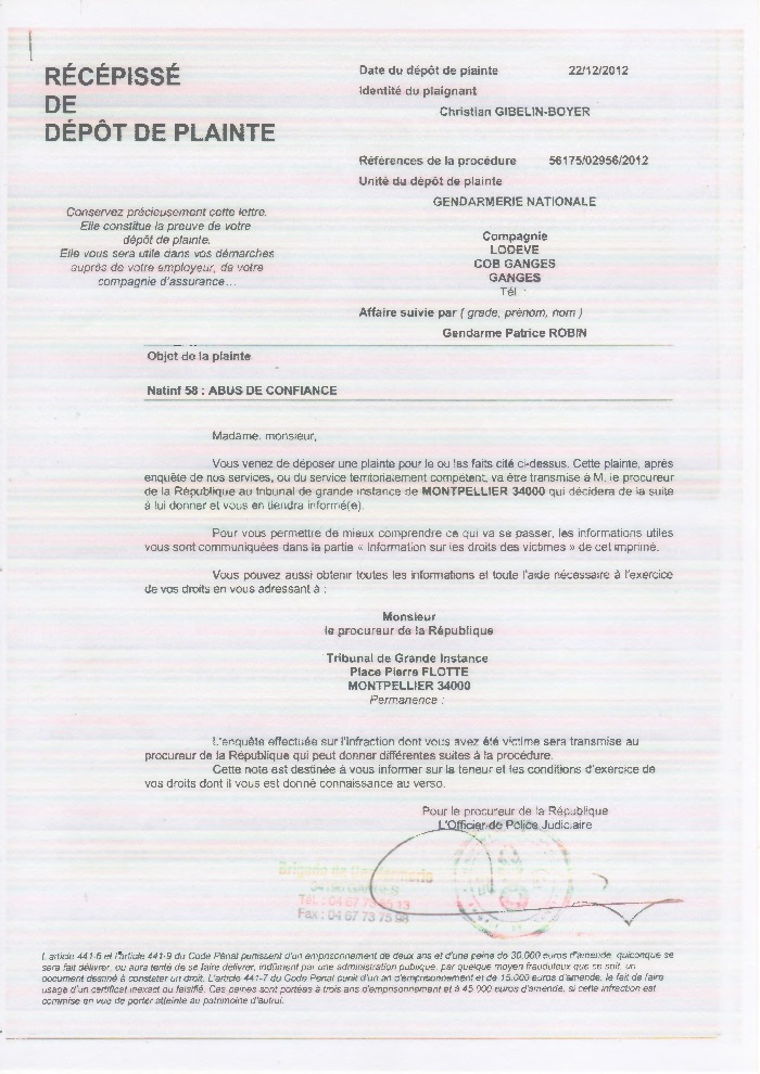 On 22 December 2012, Mr. Gibelin-Boyer has formally instituted a suit to the French State. Since then he has been asked by President Sarkozy under State Security, so can not officially act.
